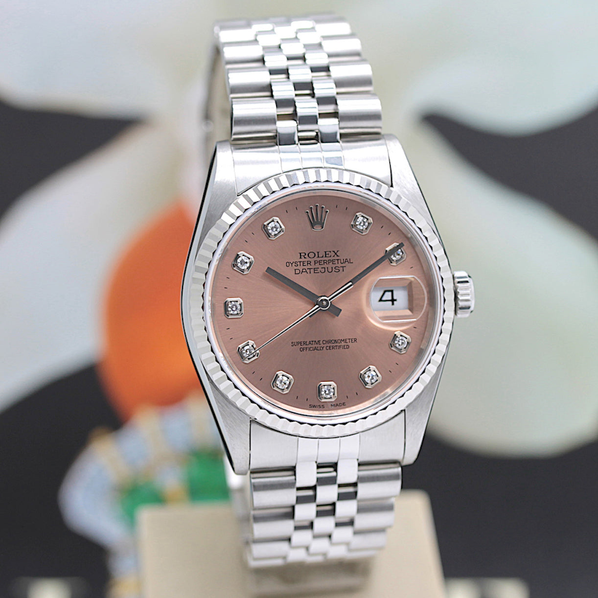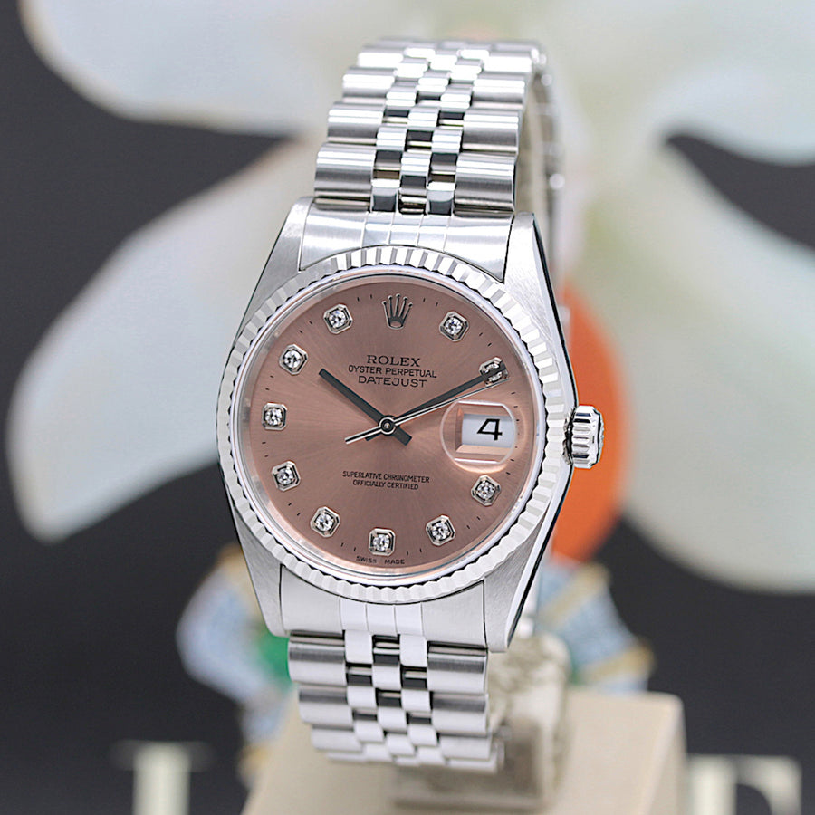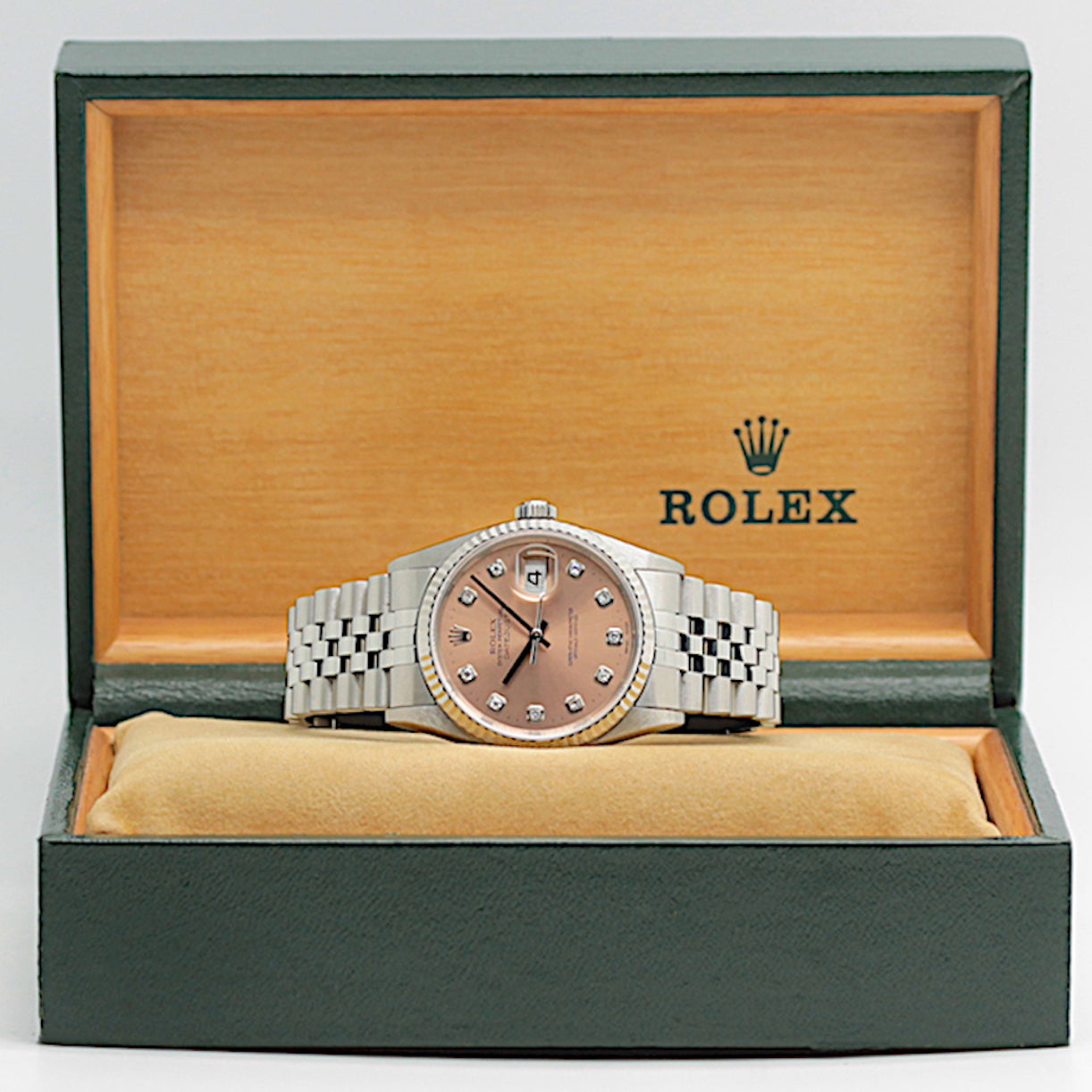 | Zifferblatt | Rose - farbig, Stahl Zeiger und Stahl Indexe, Datum auf der 3, Lünette aus 18KT Weißgold |