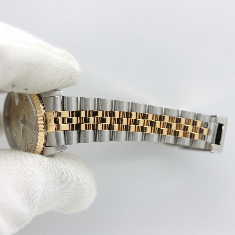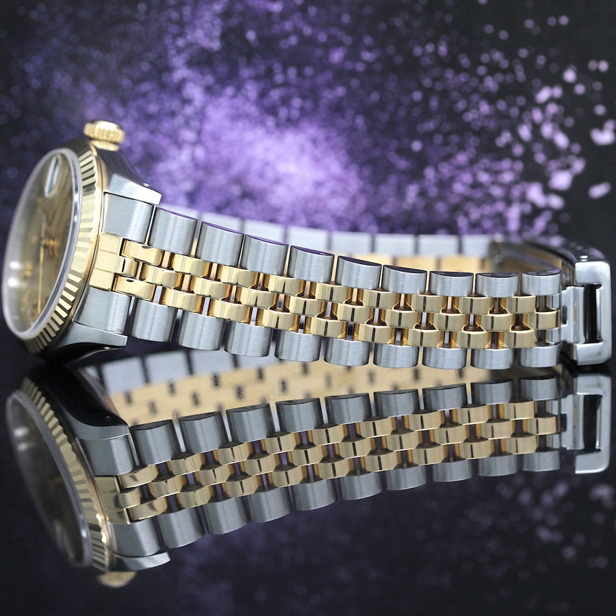 Die Uhr befindet sich in einem dem Alter entsprechend guten Zustand. Sie ist mit einem Automatikwerk ausgestattet. Das Werk wurde im Dezember 2025 geölt und gereinigt. Eine Bereicherung für jeden Uhrensammler und Liebhaber. Das Jubileeband ist in Stahl/Gold und gebraucht, aber in einem noch guten Zustand ( Jubileeband mit 16.5 cm Länge (ohne Uhr gemessen) ). Sie bieten hier auf eine Wunderschöne und klassische Armbanduhr der Spitzenklasse mit Wiedererkennungswert. Saphirglas. Das Zifferblatt ist champagner - farbig. Die Lünette ist aus 18KT Gold. Die Datejust Uhr ist 35 Jahre alt und wird in einem gebrauchten Zustand verkauft.
