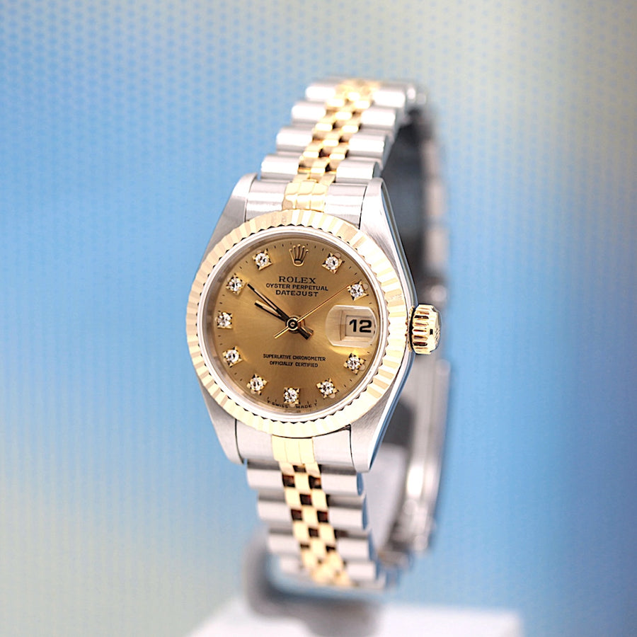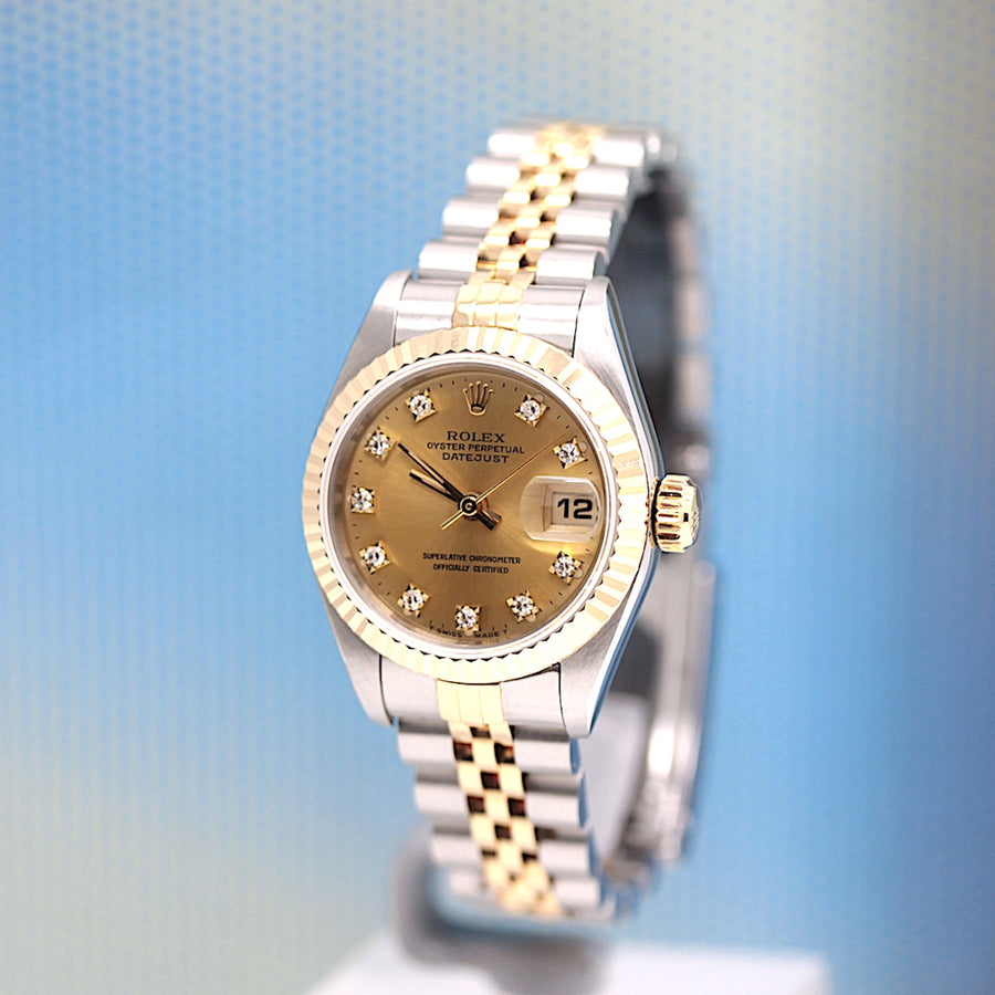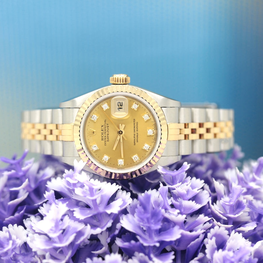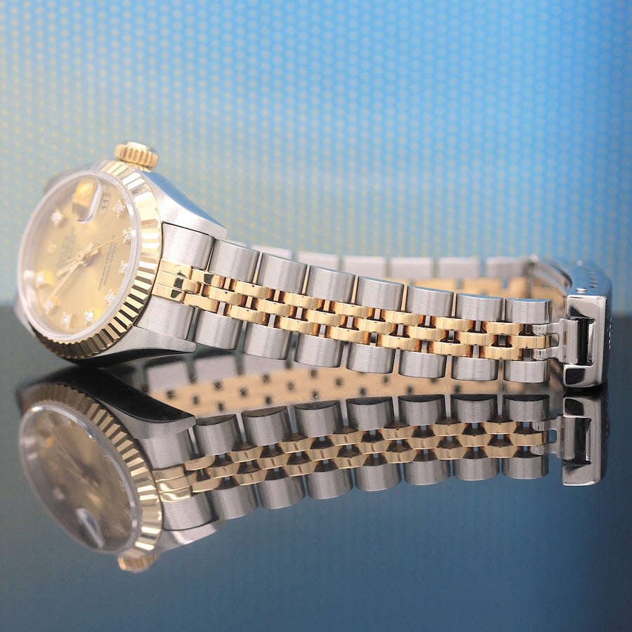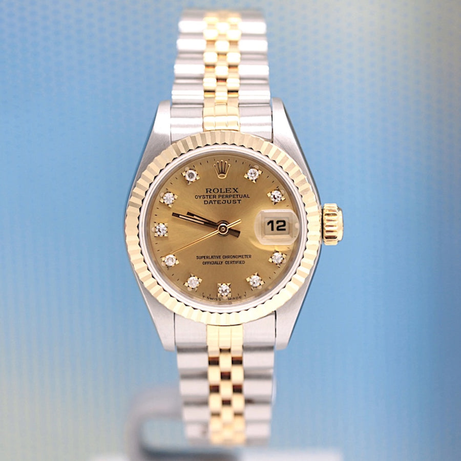 Die Uhr befindet sich in einem dem Alter entsprechend guten Zustand. Sie ist mit einem Automatikwerk ausgestattet. Das Werk wurde im März 2026 geölt und gereinigt. Eine Bereicherung für jeden Uhrensammler und Liebhaber. Das Jubileeband ist in Stahl/Gold und gebraucht, aber in einem noch guten Zustand ( Jubileeband mit 15.5 cm Länge (ohne Uhr gemessen) ). Sie bieten hier auf eine Wunderschöne und klassische Armbanduhr der Spitzenklasse mit Wiedererkennungswert. Saphirglas. Das Zifferblatt ist champagner - farbig und 10 Diamanten besetzt ( hierbei handelt es sich um einen Rolex Besatz ). Die Lünette ist aus 18KT Gelbgold. Die Datejust Uhr ist 32 Jahre alt und wird in einem gebrauchten Zustand verkauft.