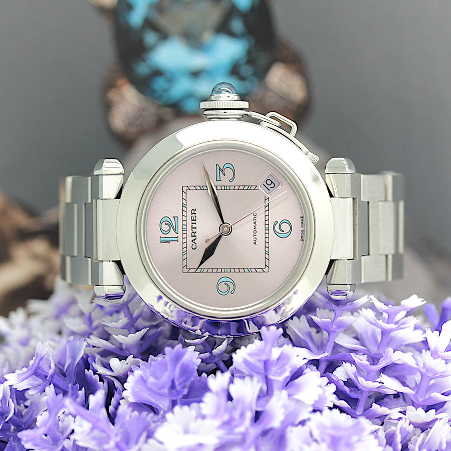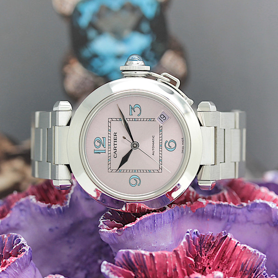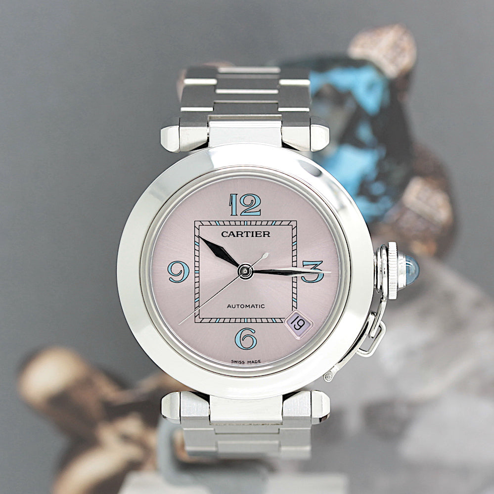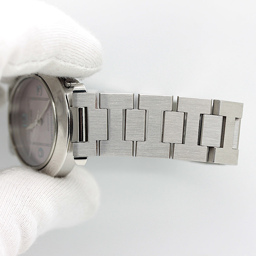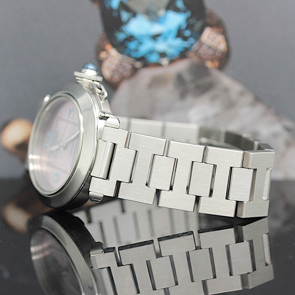 Die Uhr befindet sich in einem dem Alter entsprechend guten Zustand. Sie ist mit einem Automatikwerk ausgestattet (Das Werk wurde vom Uhrmachermeister im Februar 2026 revisioniert). Eine Bereicherung für jeden Uhrensammler und Liebhaber. Das Cartier band ist gebraucht, aber in einem noch guten Zustand. Sie bieten hier auf eine Wunderschöne und klassische Armbanduhr der Spitzenklasse mit Wiedererkennungswert. Saphirglas. Das Zifferblatt ist pink - farbig. Die Lünette ist in Stahl und gebraucht. Die Cartier Pasha Uhr wird in einem gebrauchten Zustand verkauft.