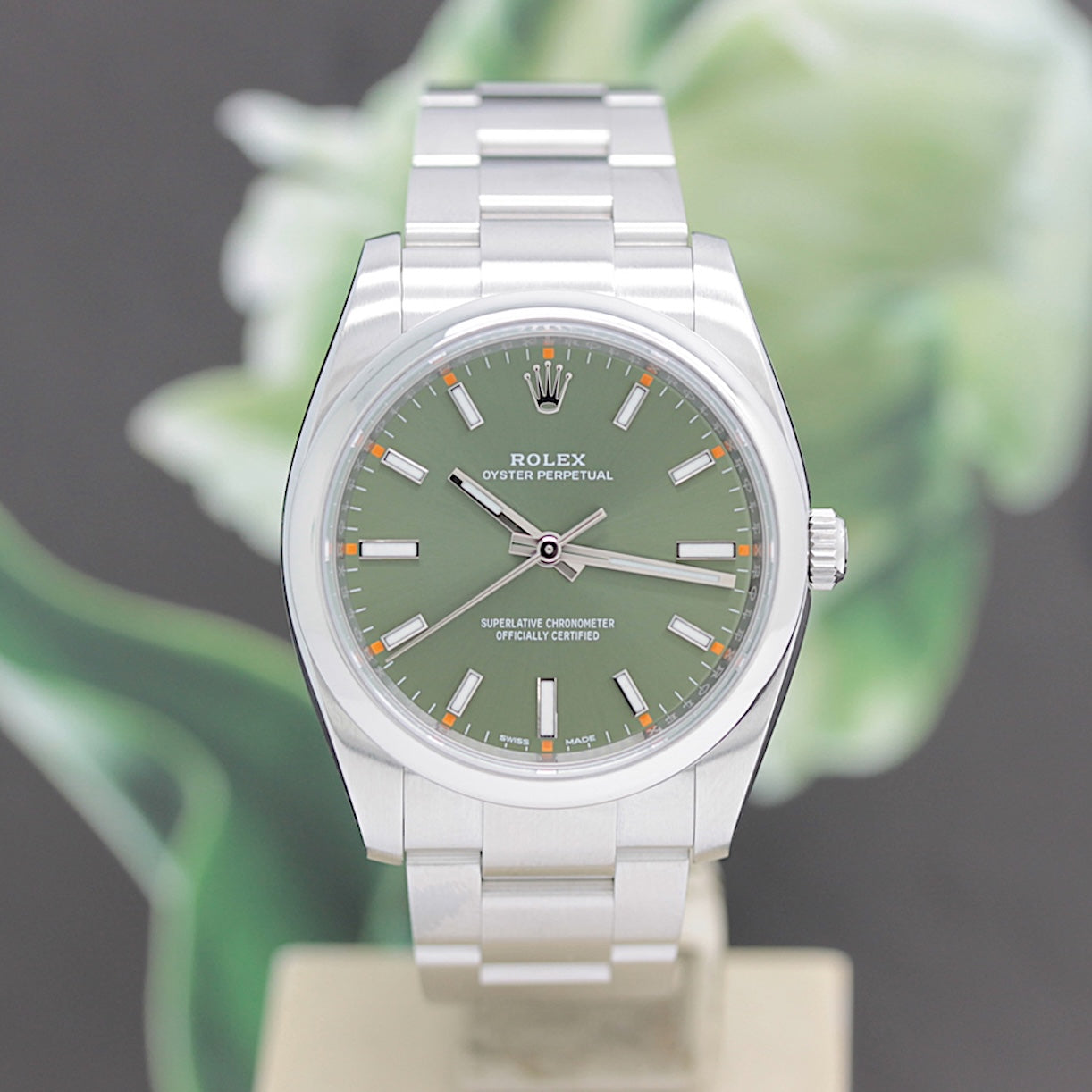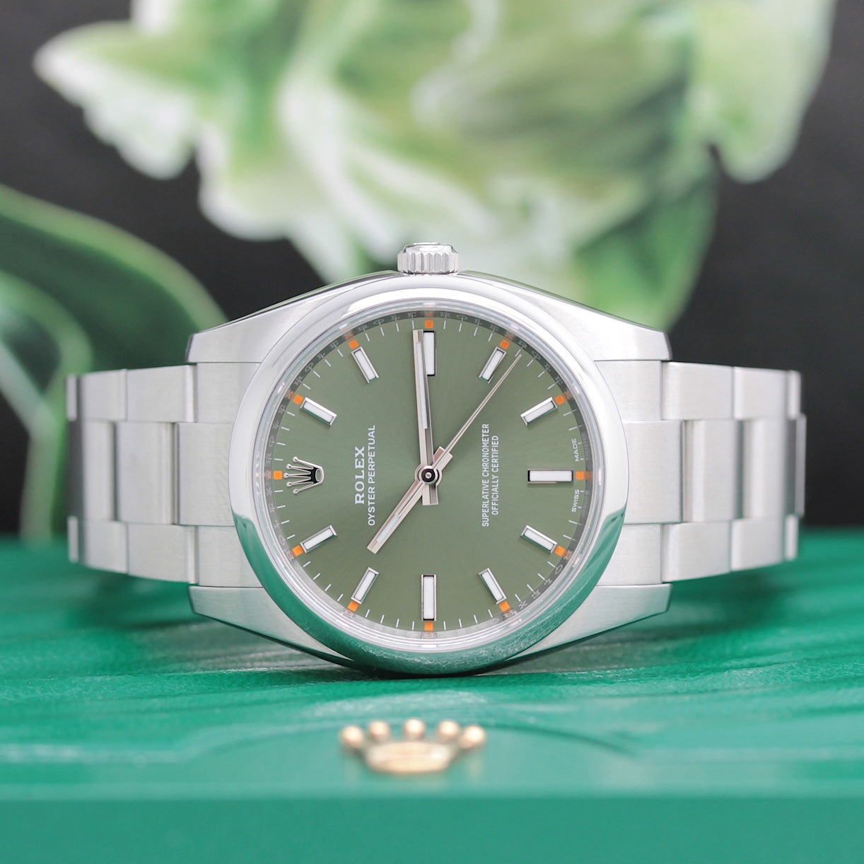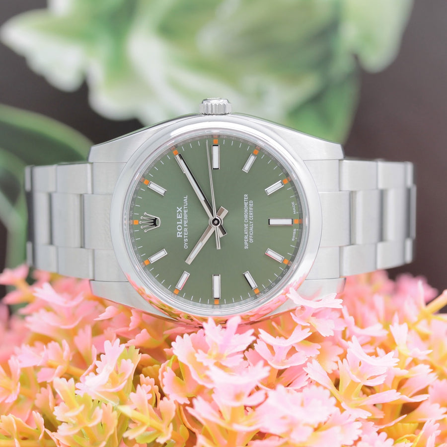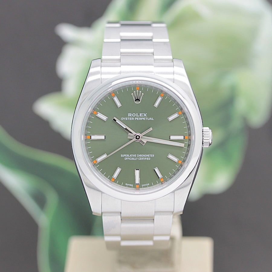 Die Uhr befindet sich in einem dem Alter entsprechend guten Zustand. Sie ist mit einem Automatikwerk ausgestattet ( Das Werk wurde vom Uhrmachermeister im März 2026 geölt und gereinigt ). Eine Bereicherung für jeden Uhrensammler und Liebhaber. Das Oysterband ist gebraucht, aber in einem noch guten Zustand. Sie bieten hier auf eine Wunderschöne und klassische Armbanduhr der Spitzenklasse mit Wiedererkennungswert. Saphirglas. Die Zifferblatt ist grün - farbig und gebraucht. Die Oyster Perpetual Uhr wird in einem gebrauchten Zustand verkauft.