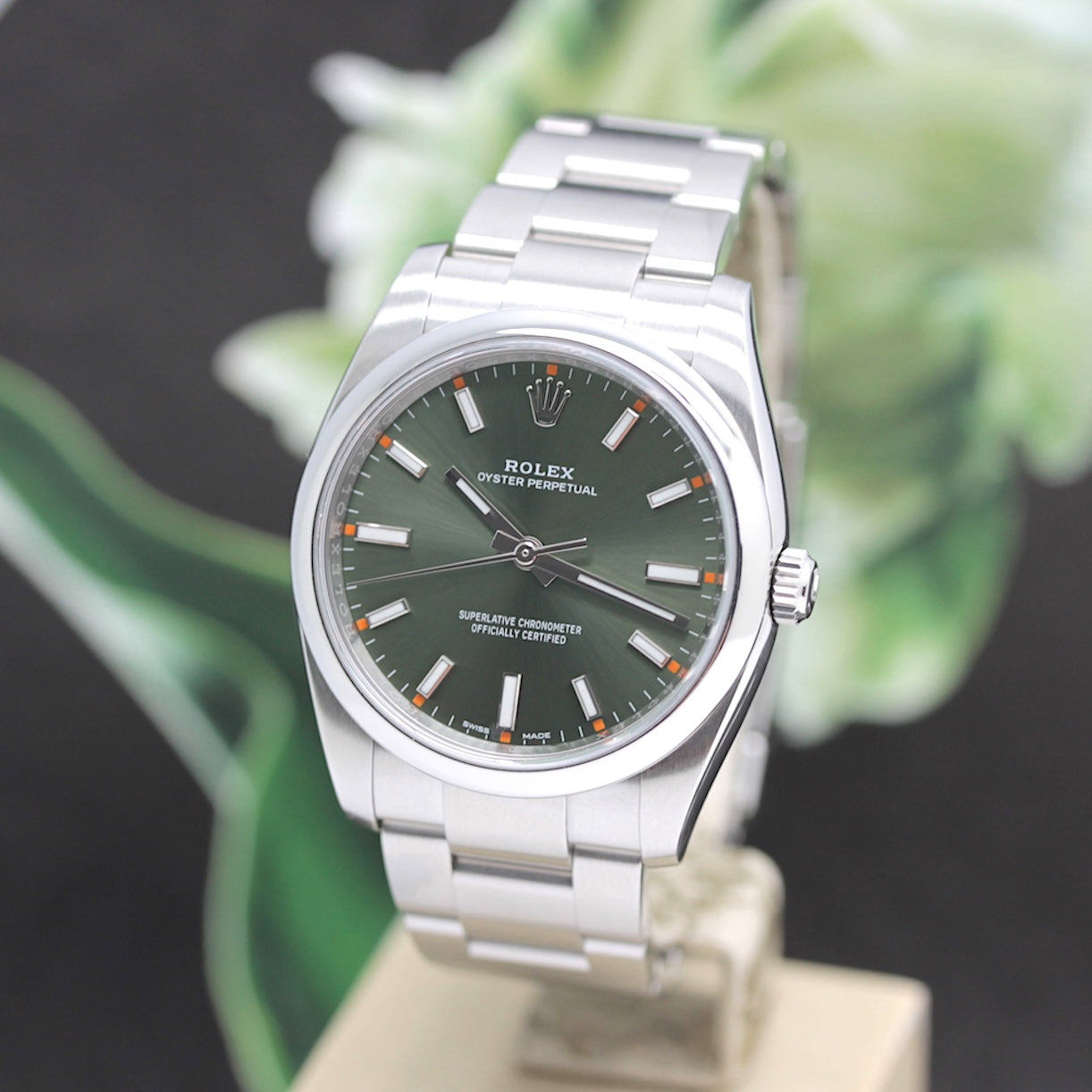| Zifferblatt | Grün - farbig, Stahl Zeiger und Stahl Indexe |