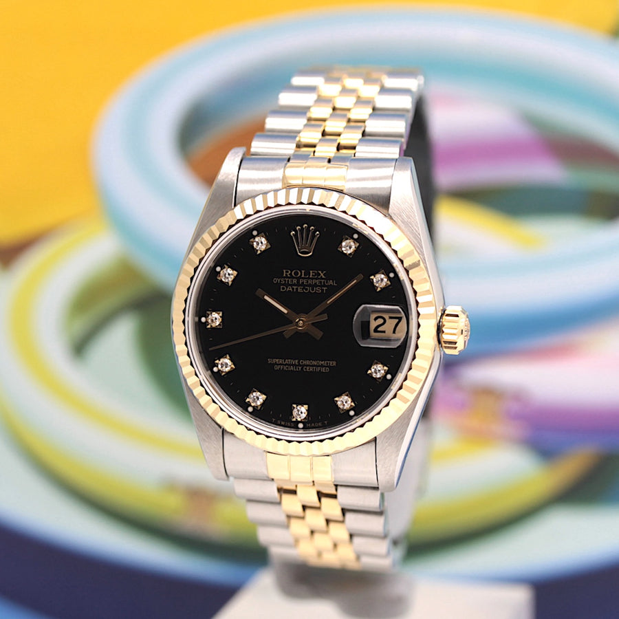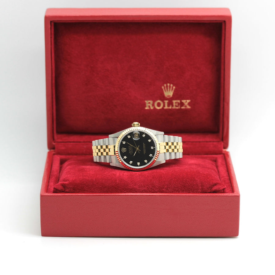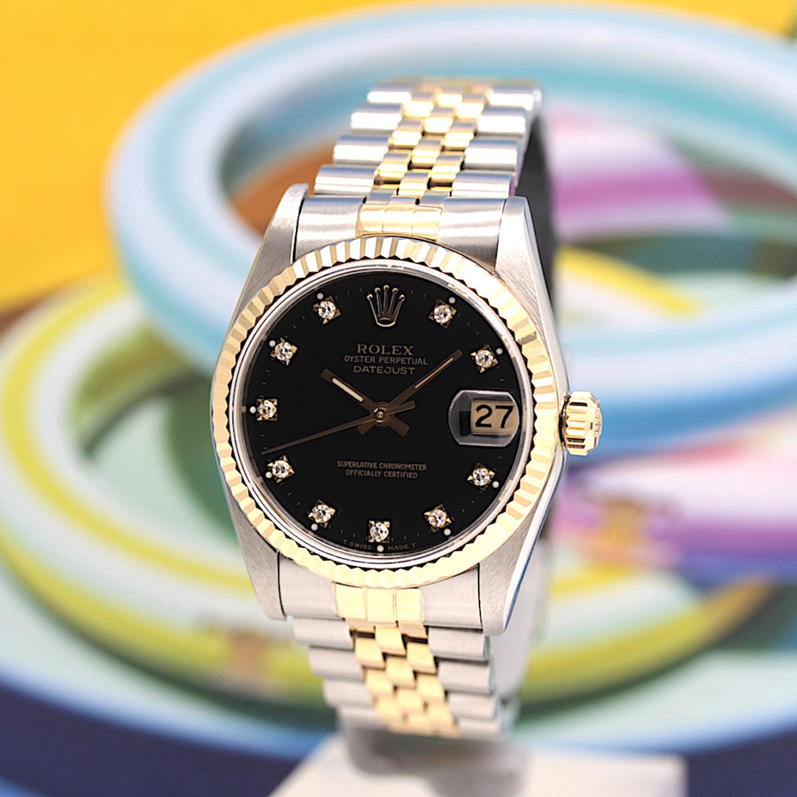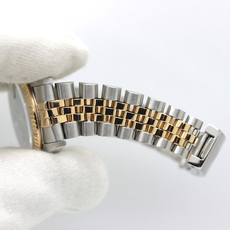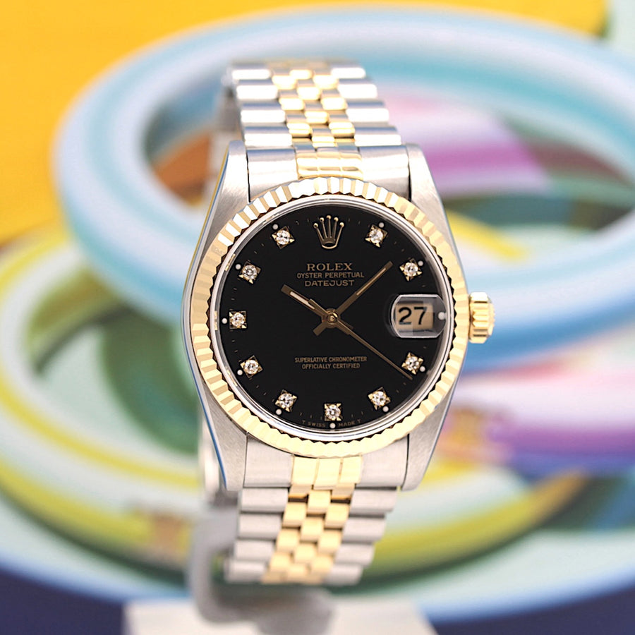 Die Uhr befindet sich in einem dem Alter entsprechend guten Zustand. Sie ist mit einem Automatikwerk ausgestattet. Das Werk wurde im Dezember 2025 geölt und gereinigt. Eine Bereicherung für jeden Uhrensammler und Liebhaber. Das Jubileeband ist in Stahl/Gold und gebraucht, aber in einem noch guten Zustand ( Jubileeband mit 15 cm Länge (ohne Uhr gemessen) ). Sie bieten hier auf eine Wunderschöne und klassische Armbanduhr der Spitzenklasse mit Wiedererkennungswert. Saphirglas. Das Zifferblatt ist schwarz - farbig und 10 Diamanten besetzt ( hierbei handelt es sich um einen Rolex Besatz ). Die Lünette ist aus 18KT Gelbgold. Die Datejust Uhr ist 27 Jahre alt und wird in einem gebrauchten Zustand verkauft.