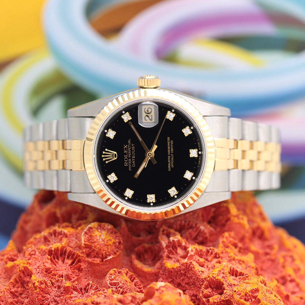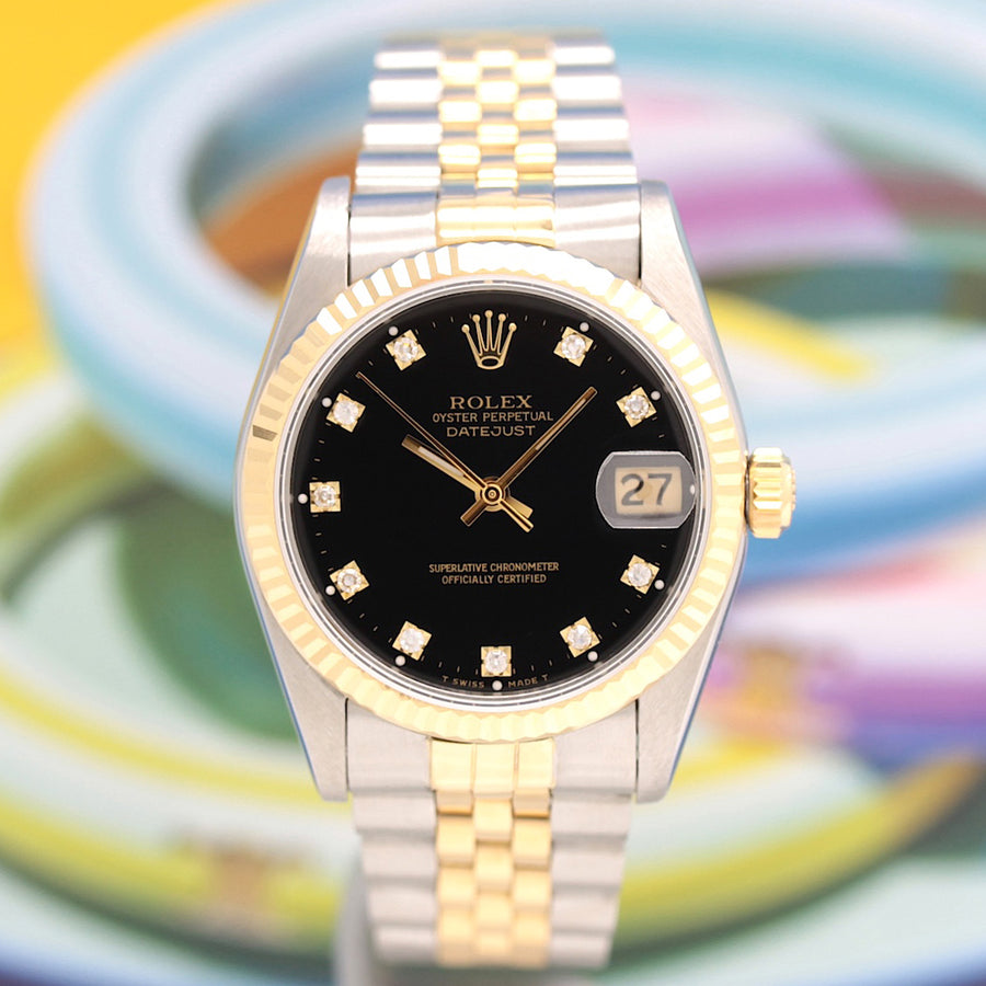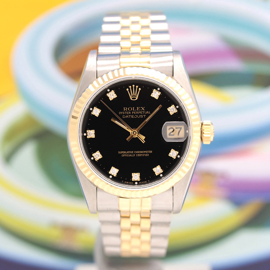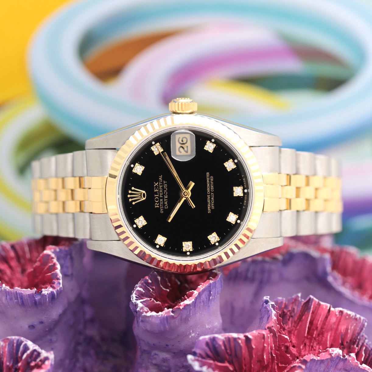 Die Uhr befindet sich in einem dem Alter entsprechend guten Zustand. Sie ist mit einem Automatikwerk ausgestattet. Das Werk wurde im Dezember 2025 geölt und gereinigt. Eine Bereicherung für jeden Uhrensammler und Liebhaber. Das Jubileeband ist in Stahl/Gold und gebraucht, aber in einem noch guten Zustand ( Jubileeband mit 15 cm Länge (ohne Uhr gemessen) ). Sie bieten hier auf eine Wunderschöne und klassische Armbanduhr der Spitzenklasse mit Wiedererkennungswert. Saphirglas. Das Zifferblatt ist schwarz - farbig und 10 Diamanten besetzt ( hierbei handelt es sich um einen Rolex Besatz ). Die Lünette ist aus 18KT Gelbgold. Die Datejust Uhr ist 27 Jahre alt und wird in einem gebrauchten Zustand verkauft.